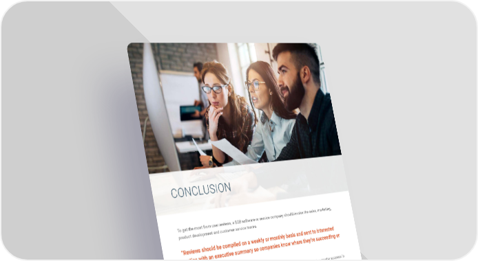 CONCLUSION To get the most from user reviews, a B2B software or service company should involve the sales, marketing, product development and customer service teams. “Reviews should be compiled on a weekly or monthly basis and sent to interested parties with an executive summary so companies know where they’re succeeding or failing,” advises Lieb. By applying what is learned from reviews in their daily activities, each department will enjoy greater success in key initiatives, including customer experience optimization, sales and marketing content development, brand awareness, product development and more. 10