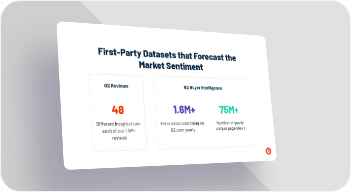 First-Party Datasets that Forecast the Market Sentiment Enterprises searching on G2.com yearly 1.6M+ Number of yearly unique page views 75M+ G2 Reviews 48 Different Insights from each of our 1.5M+ reviews G2 Buyer Intelligence