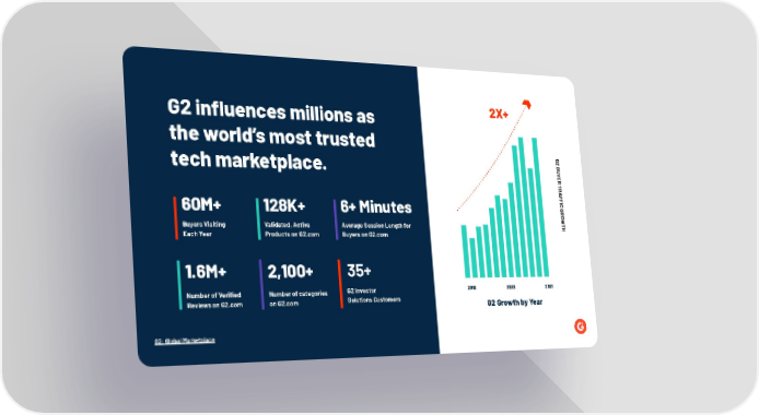 60M+ Buyers Visiting Each Year 6+ Minutes Average Session Length for Buyers on G2.com 128K+ Validated, Active Products on G2.com G2: Global Marketplace G2 Growth by Year 2019 2020 2021 G2 influences millions as the worlds most trusted tech marketplace. 1.6M+ Number of Verified Reviews on G2.com Number of categories on G2.com 2,100+ 35+ G2 Investor Solutions Customers