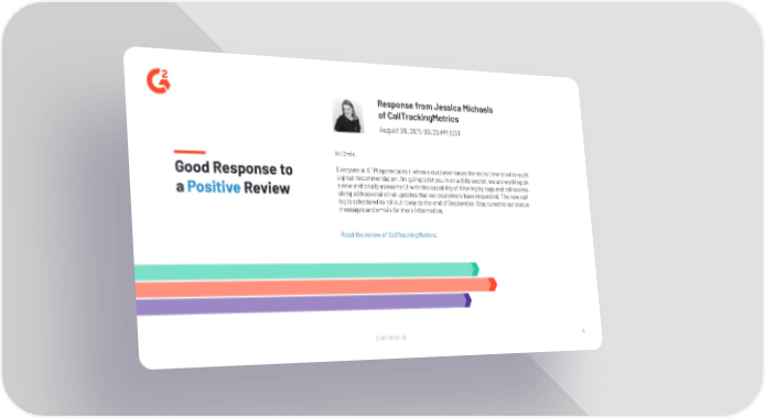 4 Confidential Hi Chris, Everyone at CTM appreciates it when a customer takes the extra time to write such a great recommendation. I’m going to let you in on a little secret, we are working on a new and totally awesome UI with the capability of filtering by tags and call scores, along with several other updates that our customers have requested. The new call log is scheduled to roll out towards the end of September. Stay tuned to our status messages and emails for more information. Good Response to a Positive Review Response from Jessica Michaels of CallTrackingMetrics August 26, 2015 06:26 PM CDT Read the review of CallTrackingMetrics.