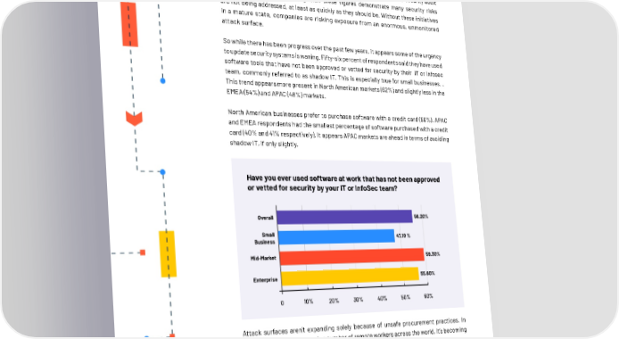 With fewer resources and staff, it’s difficult to construct and maintain security teams, properly vet potential tools, and consistently monitor complex computing environments. Nearly one in three companies with fewer than 50 employees conduct no security audit when purchasing software. Together, these figures demonstrate many security risks are not being addressed, at least as quickly as they should be. Without these initiatives in a mature state, companies are risking exposure from an enormous, unmonitored attack surface. So while there has been progress over the past few years, it appears some of the urgency to update security systems is waning. Fifty-six percent of respondents said they have used software tools that have not been approved or vetted for security by their IT or infosec team, commonly referred to as shadow IT. This is especially true for small businesses. . This trend appears more present in North American markets (62%) and slightly less in the EMEA (54%) and APAC (48%) markets. North American businesses prefer to purchase software with a credit card (56%). APAC and EMEA respondents had the smallest percentage of software purchased with a credit card (40% and 41% respectively). It appears APAC markets are ahead in terms of avoiding shadow IT, if only slightly. Attack surfaces aren’t expanding solely because of unsafe procurement practices. In addition to the rapidly growing number of remote workers across the world, it’s becoming easier to use unapproved and unsecure software without knowing. 2022 G2 Software Buyer Behavior Report 13