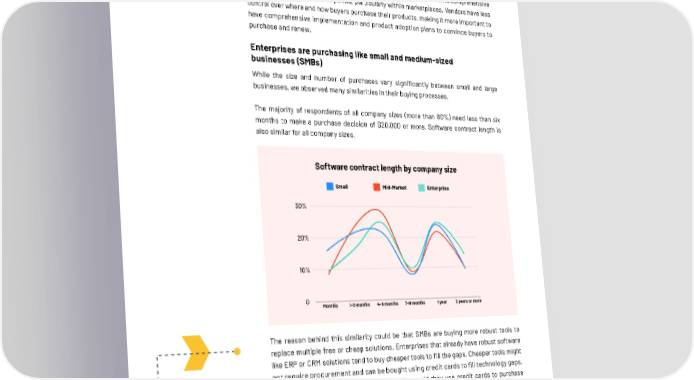 The reason behind this similarity could be that SMBs are buying more robust tools to replace multiple free or cheap solutions. Enterprises that already have robust software like ERP or CRM solutions tend to buy cheaper tools to fill the gaps. Cheaper tools might not require procurement and can be bought using credit cards to fill technology gaps. 48% percent of respondents from enterprises said they use credit cards to purchase software. Credit card purchases are quick, and the high percentage of enterprise buyers that use credit cards to purchase may be driving quicker purchase cycles for their companies. Not every enterprise purchase is for a piece of software that’ll be used company wide. The similarity in purchase behaviors between all segments may be down to smaller portions of larger companies (departments, specific teams) handling software purchases for themselves. Software vendors need to make sure that their products’ representation is comprehensive across all potential purchase points, particularly within marketplaces. Vendors have less control over where and how buyers purchase their products, making it more important to have comprehensive implementation and product adoption plans to convince buyers to purchase and renew. Enterprises are purchasing like small and medium-sized businesses (SMBs) While the size and number of purchases vary significantly between small and large businesses, we observed many similarities in their buying processes. The majority of respondents of all company sizes (more than 80%) need less than six months to make a purchase decision of $20,000 or more. Software contract length is also similar for all company sizes. 2022 G2 Software Buyer Behavior Report 8