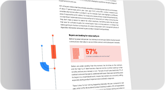 When it comes to software adoption, this disconnect may be because there’s only recently been a proliferation of SaaS spend management tools in the B2B technology landscape. If buyers won’t take the extra step to gather empirical evidence of product usage, sellers must provide tools to show proof of adoption and ROI in the early stages of implementation and use. 45% of buyers renew what they already use without considering new options, an increase of about 3 percentage points year over year (YoY), while 53% conduct research and consider alternatives when a product is up for renewal. Each side highlights a different area of required focus for sellers. For those who renew without researching alternatives, a streamlined implementation process and proof of value early on is key to ensuring that they don’t have a reason to search for other solutions. Switching costs may be lower than ever for software buyers, but some buyers have a strong aversion to change that makes getting in the door so important. It is vital to be present with transparent pieces of digestible information wherever buyers conduct research and purchase. Buyers are looking for value early on Delivering value is important, but delivery is not enough. Sellers must prove and communicate that value to secure initial contracts and subsequent renewals. Sellers are under scrutiny from the moment the ink dries on the contract, and the majority of them have less than six months to either stand up to that scrutiny and secure a renewal, or not. The lack of multi-year deals (only 11% of contracts are over two years), combined with lower-than-ever switching costs for buyers in a cloud-based world, means that vendors are constantly selling, especially during product implementation and early-stage use. There is less formal training happening internally this year compared to last year, which shifts the burden of product training to sellers. 16% of respondents said that their organization doesn’t conduct any formal training and relied on employees to learn the software tool themselves compared to 5% who reported this in 2021. The lack of training infrastructure is an opportunity for sellers to create comprehensive product training programs that are sandwiched in with the implementation process. of buyers use tools to track software adoption. 13% of software contracts are six months or less.² 57% 2022 G2 Software Buyer Behavior Report 5