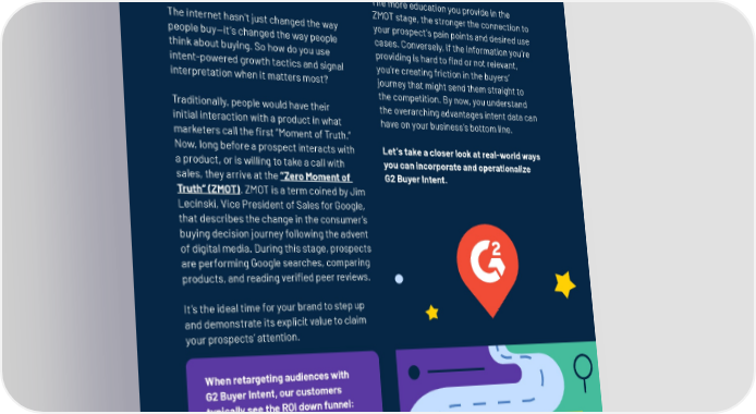 Understanding the Zero Moment of Truth. And we’re finally here! The more education you provide in the ZMOT stage, the stronger the connection to The internet hasn’t just changed the way your prospect’s pain points and desired use people buy—it’s changed the way people cases. Conversely, if the information you’re think about buying. So how do you use providing is hard to find or not relevant, intent-powered growth tactics and signal you’re creating friction in the buyers’ interpretation when it matters most? journey that might send them straight to the competition. By now, you understand Traditionally, people would have their the overarching advantages intent data can initial interaction with a product in what have on your business’s bottom line. marketers call the first “Moment of Truth.” Now, long before a prospect interacts with Let’s take a closer look at real-world ways a product, or is willing to take a call with you can incorporate and operationalize sales, they arrive at the “Zero Moment of G2 Buyer Intent. Truth” (ZMOT). ZMOT is a term coined by Jim Lecinski, Vice President of Sales for Google, that describes the change in the consumer’s buying decision journey following the advent of digital media. During this stage, prospects are performing Google searches, comparing products, and reading verified peer reviews. It’s the ideal time for your brand to step up and demonstrate its explicit value to claim your prospects’ attention. When retargeting audiences with G2 Buyer Intent, our customers typically see the ROI down funnel: as MQLs convert to pipeline and revenue. Check out the case studies on page 30 for real-world examples of how marketing teams drive smarter growth with intent- fueled campaigns. 2424 ThThe Big Book oe Big Book of Intf Intent ent 2424
