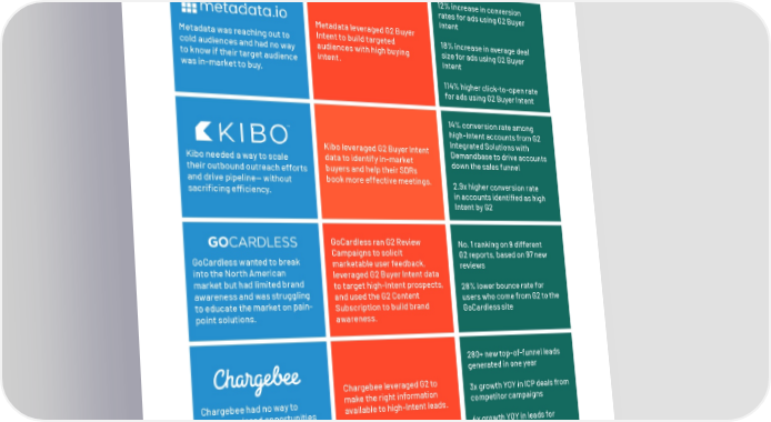 And speaking of some of G2’s savviest customers, here are a few examples of how real marketers use G2 Buyer Intent to fuel demand and feed the funnel. Growth marketing Solutions driven by Performance challenge G2 Buyer Intent 12% increase in conversion rates for ads using G2 Buyer Intent Metadata leveraged G2 Buyer Metadata was reaching out to Intent to build targeted 18% increase in average deal cold audiences and had no way audiences with high buying size for ads using G2 Buyer to know if their target audience intent. Intent was in-market to buy. 114% higher click-to-open rate for ads using G2 Buyer Intent 14% conversion rate among high-Intent accounts from G2 Kibo leveraged G2 Buyer Intent Integrated Solutions with Kibo needed a way to scale data to identify in-market Demandbase to drive accounts their outbound outreach efforts buyers and help their SDRs down the sales funnel and drive pipeline— without book more effective meetings. 2.9x higher conversion rate sacrificing efficiency. in accounts identified as high Intent by G2 GoCardless ran G2 Review No. 1 ranking on 9 different GoCardless wanted to break Campaigns to solicit G2 reports, based on 97 new into the North American marketable user feedback, reviews market but had limited brand leveraged G2 Buyer Intent data awareness and was struggling to target high-Intent prospects, 28% lower bounce rate for to educate the market on pain- and used the G2 Content users who come from G2 to the point solutions. Subscription to build brand GoCardless site awareness. 280+ new top-of-funnel leads generated in one year Chargebee leveraged G2 to 3x growth YOY in ICP deals from Chargebee had no way to make the right information competitor campaigns capture missed opportunities available to high-Intent leads. from inbound searches against 4x growth YOY in leads for competitors. Europe-based competitor campaigns The Big Book of Intent 30
