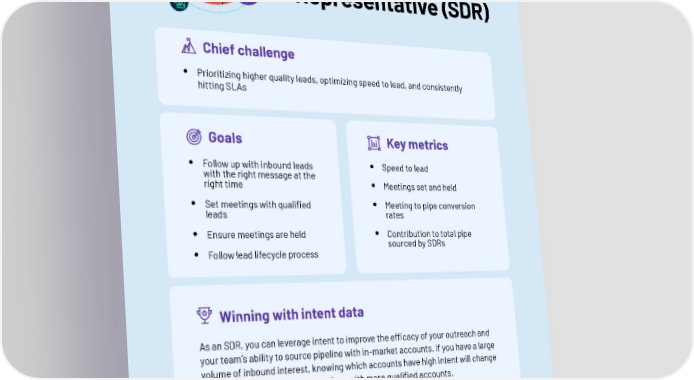The Sales Development Representative (SDR) Chief challenge • Prioritizing higher quality leads, optimizing speed to lead, and consistently hitting SLAs Goals Key metrics • Follow up with inbound leads • Speed to lead with the right message at the right time • Meetings set and held • Set meetings with qualified • Meeting to pipe conversion leads rates • Ensure meetings are held • Contribution to total pipe • Follow lead lifecycle process sourced by SDRs Winning with intent data As an SDR, you can leverage intent to improve the efficacy of your outreach and your team’s ability to source pipeline with in-market accounts. If you have a large volume of inbound interest, knowing which accounts have high intent will change your focus and help you set meetings with more qualified accounts. ThThe Big Book oe Big Book of Intf Intent ent 1111