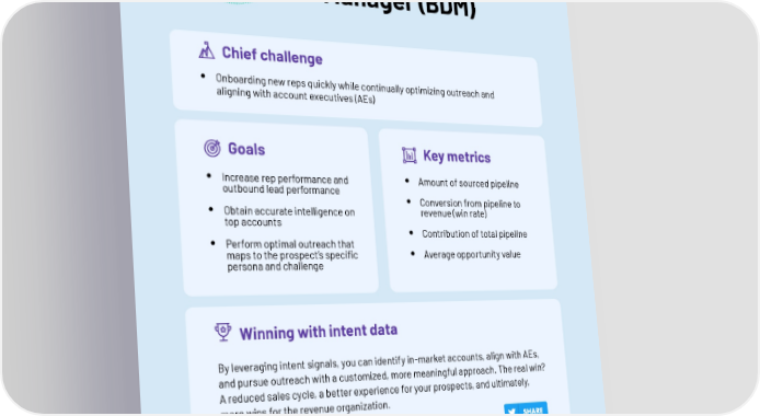 The Business Development Manager (BDM) Chief challenge • Onboarding new reps quickly while continually optimizing outreach and aligning with account executives (AEs) Goals Key metrics • Increase rep performance and • Amount of sourced pipeline outbound lead performance • Conversion from pipeline to • Obtain accurate intelligence on revenue (win rate) top accounts • Contribution of total pipeline • Perform optimal outreach that maps to the prospect’s specific • Average opportunity value persona and challenge Winning with intent data By leveraging intent signals, you can identify in-market accounts, align with AEs, and pursue outreach with a customized, more meaningful approach. The real win? A reduced sales cycle, a better experience for your prospects, and ultimately, more wins for the revenue organization. ThThe Big Book oe Big Book of Intf Intent ent 1212