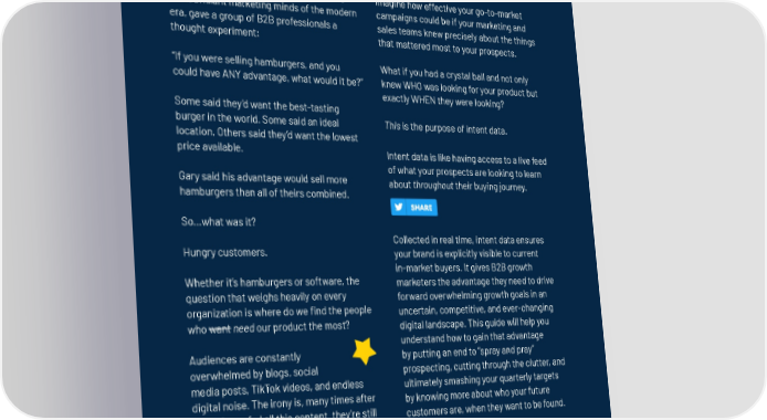 Driving Intentional Demand Is a Modern-Day Must. Gary Halbert, widely considered one of the Imagine how effective your go-to-market most brilliant marketing minds of the modern campaigns could be if your marketing and era, gave a group of B2B professionals a sales teams knew precisely about the things thought experiment: that mattered most to your prospects. “If you were selling hamburgers, and you What if you had a crystal ball and not only could have ANY advantage, what would it be?” knew WHO was looking for your product but exactly WHEN they were looking? Some said they’d want the best-tasting burger in the world. Some said an ideal This is the purpose of intent data. location. Others said they’d want the lowest price available. Intent data is like having access to a live feed of what your prospects are looking to learn Gary said his advantage would sell more about throughout their buying journey. hamburgers than all of theirs combined. So…what was it? Collected in real time, intent data ensures Hungry customers. your brand is explicitly visible to current in-market buyers. It gives B2B growth Whether it’s hamburgers or software, the marketers the advantage they need to drive question that weighs heavily on every forward overwhelming growth goals in an organization is where do we find the people uncertain, competitive, and ever-changing who want need our product the most? digital landscape. This guide will help you understand how to gain that advantage Audiences are constantly by putting an end to “spray and pray” overwhelmed by blogs, social prospecting, cutting through the clutter, and media posts, TikTok videos, and endless ultimately smashing your quarterly targets digital noise. The irony is, many times after by knowing more about who your future being force-fed all this content, they’re still customers are, when they want to be found. left hungry for the information they’re looking for. 2
