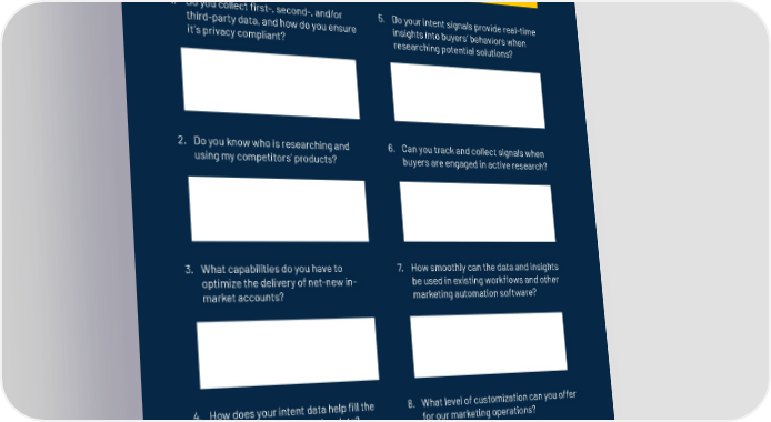 The Intent Buyer Cheat Sheet Now that you're ready to incorporate intent data into your sales & marketing playbook, it's time to evaluate options. Here’s a list of questions that will ensure the data you’re getting is reliable, verifiable, and will work for your specific needs. 1. Do you collect first-, second-, and/or 5. Do your intent signals provide real-time third-party data, and how do you ensure insights into buyers’ behaviors when it’s privacy compliant? researching potential solutions? 2. Do you know who is researching and 6. Can you track and collect signals when using my competitors’ products? buyers are engaged in active research? 3. What capabilities do you have to 7. How smoothly can the data and insights optimize the delivery of net-new in- be used in existing workflows and other market accounts? marketing automation software? 4. How does your intent data help fill the 8. What level of customization can you offer gaps and enrich my existing data? for our marketing operations? Now save this page and share with your team to ThThe Big Book oe Big Book of Intf Intent ent compare research notes! 1919