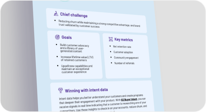 The Customer Marketer Chief challenge • Reducing churn while maintaining a strong competitive advantage, and brand trust validated by customer success Goals Key metrics • Build customer advocacy • Net retention rate and a library of user- generated content • Customer adoption • Increase lifetime value (LTV) • Community engagement of retained customers • Number of referrals • Upsell new capabilities and maintain an exceptional customer experience Winning with intent data Intent data helps you better understand your customers and create programs that deepen their engagement with your product. With G2 Buyer Intent, you can receive signals in real time indicating that a customer is researching one of your competitors. Use these insights to check in on your accounts, reduce churn, and increase stickiness and value from your product. ThThe Big Book oe Big Book of Intf Intent ent 99