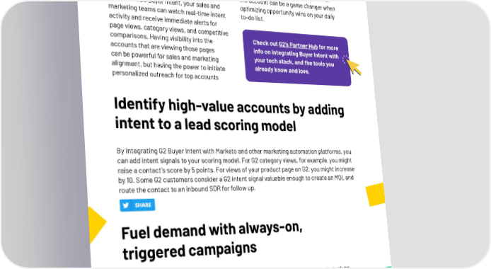 T I H W O G T 2 W O Power on-demand personalization H with real-time alerts Does your team use Slack, Marketo, HubSpot, immediately and inform CSMs that it Zapier, or other leading integrations to might be time to check on the health of get real-time alerts on account activity? the account can be a game changer when Now with G2’s Buyer Intent, your sales and optimizing opportunity wins on your daily marketing teams can watch real-time intent to-do list. activity and receive immediate alerts for page views, category views, and competitive comparisons. Having visibility into the Check out G2’s Partner Hub for more accounts that are viewing those pages info on integrating Buyer Intent with can be powerful for sales and marketing your tech stack, and the tools you alignment, but having the power to initiate already know and love. personalized outreach for top accounts Identify high-value accounts by adding intent to a lead scoring model By integrating G2 Buyer Intent with Marketo and other marketing automation platforms, you can add intent signals to your scoring model. For G2 category views, for example, you might raise a contact's score by 5 points. For views of your product page on G2, you might increase by 10. Some G2 customers consider a G2 intent signal valuable enough to create an MQL and route the contact to an inbound SDR for follow up. Fuel demand with always-on, triggered campaigns Marketers can leverage G2 Buyer Intent signals to create custom workflows to nurture smart lists, trigger engagement events, and add net-new accounts to existing smart lists to keep your pipeline pumped with qualified demand. For instance, when an account hits your product or category page on G2.com, you can trigger a promotional campaign to register for your latest on-demand webinar. Then you can watch your lead scores kick up a notch for the accounts showing they’re a few steps closer to picking your product over the rest. The Big Book of Intent 25