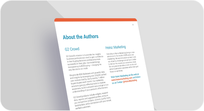 25 About the Authors G2 Crowd Heinz Marketing G2 Crowd’s mission is to provide the insights Everyday at Heinz Marketing brings a new business professionals need to gain confidence adventure in the world of B2B sales and in their buying decisions and become more marketing . We are innovators at heart, and successful in their jobs . Our model brings not afraid to challenge convention in order transparency to B2B buying — changing the to deliver the results our customers need . way decisions are made . We are passionate about what we do and We provide B2B Marketers with powerful data strive to promote outcomes rather than just and insights by leveraging over 250,000 verified focus on activities . user reviews read by nearly read by 1 million Visit Heinz Marketing on the web at buyers buyers each month . Our marketing www.heinzmarketing.com and follow solutions give you effective tools to improve us on Twitter @HeinzMarketing awareness, build trustworthiness and get a true understanding of your product’s effectiveness . G2 Crowd products include widgets, research data, reports and upgraded profiles, and give you competitive analysis, content, quality leads, testimonials, and a connection with your actual, verified customers. Visit G2 Crowd on the web at www.g2crowd.com and follow us on Twitter @G2Crowd 2 CROWD