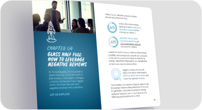 Today’s buyer selection process revolves around education and trust. In fact, 85% of technology 85% decision-makers read up to 10 online reviews before making a purchase — and 53% rely on peer 53% recommendations, per G2 Crowd’s latest research CHAPTER 04 on customer reviews. Honest voices from savvy customers help to build GLASS HALF FULL: credibility and transparency around your products HOW TO LEVERAGE or services in a way that traditional advertising cannot. Take it from the experts, as user behavior NEGATIVE REVIEWS on G2 Crowd recently showed that: As the saying goes, it’s impossible to negative reviews (those with please everyone. But in the world of one or two stars) receive nearly B2B reviews, a frustrated or unhappy 200% to 300% more clicks and customer can be one of your biggest 300% views than positive reviews. assets. It’s true: You can turn For marketers, this reveals untapped opportunity negative reviews into a positive. to leverage reviews without the stress of striving LET US EXPLAIN. for perfection. And when it comes to making lackluster feedback work in your favor, try the following quick roadmap to success. 12