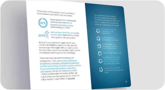 The evolution of the buying process has embraced We’ve created this guide to explore the transparency provided by real user reviews. how B2B marketers can take better advantage of the review ecosystem that Recent research from Northwestern exists — whether they’re participating 95% University shows that 95% of in it or not. In this guide, we’ll examine: shoppers use online reviews before making a purchase. Why reviews are becoming increasingly important And a product with five reviews has to B2B marketers 270% a 270% higher likelihood of purchase How B2B marketers can than a product with zero reviews. leverage B2B product reviews Because buyers want more insight into the value, How B2B marketers can function, and reliability of products, they use many encourage their customers sources to gain this insight. Often, our peers provide to write product reviews this information, and many times their insight is devoid of traditional advertising and brand messaging. How to leverage negative reviews This is even more relevant for businesses and Why B2B product reviews are professionals. In fact, peer-to-peer, influencer, part of a larger push toward practitioner, colleague, and authenticated and investing in customer voice verified user reviews are today’s primary sources as a business and marketer for pre-purchase B2B guidance, education, Success stories on how B2B and research. We see this firsthand as 550,000+ marketers are leveraging product LinkedIn authenticated and human verified user reviews inform purchasing decisions for nearly two reviews. million monthly unique visitors on G2 Crowd. 05