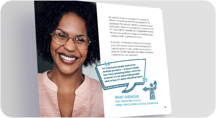 By using G2 Crowd as a key part of its marketing efforts, Kimble has leveled the playing field for its specialized PSA solution. Kimble’s customer success teams point clients and prospective customers to the G2 Crowd site for impartial and independent reviews. Reviews also establish an important feedback loop, creating a better experience for users. In addition, Kimble sees a trend toward moving away from product suites to individual products. Capitalizing on this idea, Kimble ensures that its products can be integrated with other software to customize the user experience. m o r e f c i ho e c l p s peo e v i er d g tt w a o r ’t m 2 C sn G e o t d ers — i d i v s o a e pr m h l r p i ti l u rs a f m a l l o g d n eti rk a e y m l n p a g peo w m n ho li l e ut t bo t a o rs. s n ’ e . It y d u n g b pe n ti o s a t c u ut ed bo s a ’ t ; i y u o b t t a h w MARK ROBINSON CHIEF MARKETING OFFICER, KIMBLE PROFESSIONAL SERVICES AUTOMATION 21