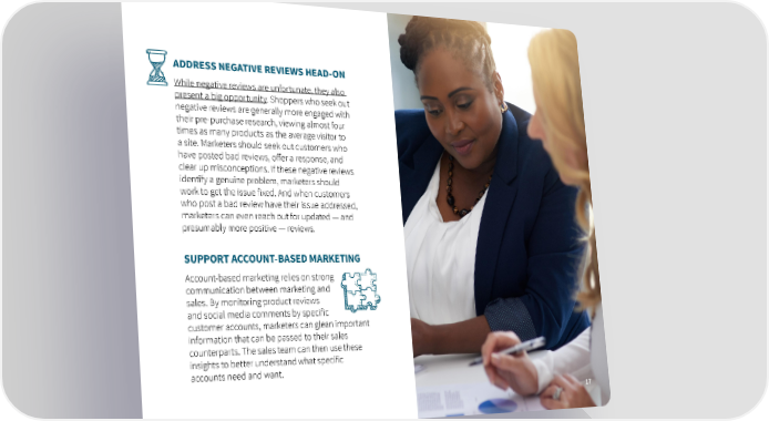 ADDRESS NEGATIVE REVIEWS HEAD-ON While negative reviews are unfortunate, they also present a big opportunity. Shoppers who seek out negative reviews are generally more engaged with their pre-purchase research, viewing almost four times as many products as the average visitor to a site. Marketers should seek out customers who have posted bad reviews, offer a response, and clear up misconceptions. If these negative reviews identify a genuine problem, marketers should work to get the issue fixed. And when customers who post a bad review have their issue addressed, marketers can even reach out for updated — and presumably more positive — reviews. SUPPORT ACCOUNT-BASED MARKETING Account-based marketing relies on strong communication between marketing and sales. By monitoring product reviews and social media comments by specific customer accounts, marketers can glean important information that can be passed to their sales counterparts. The sales team can then use these insights to better understand what specific accounts need and want. 17