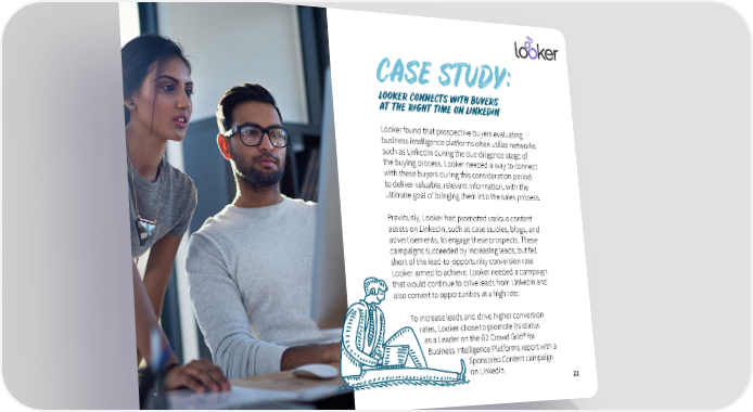 CASE STUDY: LOOKER CONNECTS WITH BUYERS AT THE RIGHT TIME ON LINKEDIN Looker found that prospective buyers evaluating business intelligence platforms often utilize networks such as LinkedIn during the due diligence stage of the buying process. Looker needed a way to connect with these buyers during this consideration period to deliver valuable, relevant information, with the ultimate goal of bringing them into the sales process. Previously, Looker had promoted various content assets on LinkedIn, such as case studies, blogs, and advertisements, to engage these prospects. These campaigns succeeded by increasing leads, but fell short of the lead-to-opportunity conversion rate Looker aimed to achieve. Looker needed a campaign that would continue to drive leads from LinkedIn and also convert to opportunities at a high rate. To increase leads and drive higher conversion rates, Looker chose to promote its status as a Leader on the G2 Crowd Grid® for Business Intelligence Platforms report with a Sponsored Content campaign on LinkedIn. 22