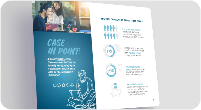 TECHNOLOGY BUYERS TRUST THEIR PEERS 8 in 10 decision-makers look outside the buying committee for information and counsel on B2B solutions. CASE Reviews, surveys, and usage 51% stats from fellow technology IN POINT: users make up 51% of today’s trusted sources. A recent survey from LinkedIn found that online ratingS and reviews Play 70% of technology a significant role in over 70% buyers are likely to discuss halF oF all technology solutions or vendors with Purchases. their professional peers. External discussions around technology solutions and products are highly leveraged resources for both IT and non-IT functions. 04