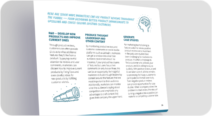 HERE ARE SEVEN WAYS MARKETERS CAN USE PRODUCT REVIEWS THROUGHOUT THE FUNNEL — FROM DESIGNING BETTER PRODUCT ENHANCEMENTS TO UPSELLING AND CROSS-SELLING EXISTING CUSTOMERS. R&D — DEVELOP NEW PRODUCE THOUGHT GENERATE PRODUCTS AND IMPROVE LEADERSHIP AND CASE STUDIES CURRENT ONES OTHER CONTENT For marketing teams looking to Through product reviews, By monitoring product reviews and feature customer voices, positive customers can often provide customer comments on social media product reviews are a must-have. clues as to what additional platforms such as LinkedIn, marketers In the past, case studies have features they’d like from a can get a window into what their been challenging for marketers to product. By paying careful audience cares most about. For produce. It’s often a challenge to attention to reviews and user instance, if your product has dozens find a customer who: a) loves your comments, marketers can of features but users focus their product, and b) is willing to say so discern how to improve current comments on only two or three, this publicly. With positive reviews, a) and products by fixing flaws and can be an opportunity for insightful b) are taken care of; all that remains even develop ideas for marketers to build thought leadership is convincing the happy customer to new products by fulfilling content around the features that are participate in a formal case study. customer wishes. most important to their audience. Even negative product reviews Additionally, marketers can monitor can provide opportunities for case what the audience is saying about studies. When a company solves the competitors and emphasize any problem in a bad review, the story of advantages to craft content that turning a negative into a positive can gives their company the upper hand. make for a compelling customer tale. 16
