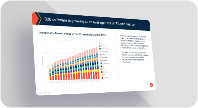 B2B software is growing at an average rate of 7% per quarter Over the past five years, the software Number of software listings on the G2 marketplace 2018-2023 industry has seen explosive growth driven by increased digital reliance across industries, the widespread Other adoption of cloud computing and SaaS, Sales Tools and notably, the leaps in AI and ML. Content Management IT Management Software has become a linchpin of Security modern business, with AI storming onto the scene - driving unparalleled Development innovation across all categories Commerce of software. IT Infrastructure HR ERP Marketing Office Vertical Industry Source: G2 data