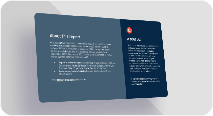 About this report About G2 G2’s State of Software Report examines trends from its B2B software G2 is the world's largest and most trusted marketplace, based on proprietary data across 2 million+ trusted software marketplace. More than 80 reviews, 150,000+ products and services, 2,000+ categories, and 80 million people annually — including million annual visitors. Insights are based on data analysis from employees at all Fortune 500 companies September 2022 - September 2023 unless otherwise noted, to reflect — use G2 to make smarter software trends over the past year observed on G2. decisions based on authentic peer reviews. Thousands of software and ● Report authors include: Shaun Bishop, Victoria Blackwell, Chase services companies of all sizes partner Cunningham, Jenny Gardynski, Stephanie Graham, Jeffrey Lin, with G2 to build their reputation and grow Matthew Miller, Priya Patel, Grace Savides, Chris Voce their business — including Salesforce, ● Report contributors include: Daniella Alscher, Sarah Reks, HubSpot, Zoom, and Adobe. Mike Puglielli Visit research.G2.com to learn more. To learn more about where you go for software, visit www.G2.com and follow us on LinkedIn. G2 is the world's largest and most trusted software marketplace. More than 80 million people annually — including employees at all Fortune 500 companies — use G2 to make smarter software decisions based on authentic peer reviews. Thousands of software and services companies of all sizes partner with G2 to build their reputation and grow their business — including Salesforce, HubSpot, Zoom, and Adobe. To learn more about where you go for software, visit www.g2.com and follow us on LinkedIn.