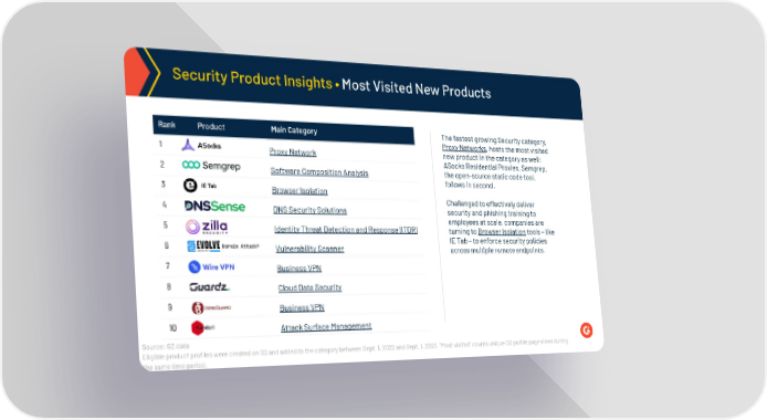 Security Product Insights • Most Visited New Products Rank Product Main Category The fastest growing Security category, Proxy Networks, hosts the most visited 1 new product in the category as well: Proxy Network ASocks Residential Proxies. Semgrep, 2 the open-source static code tool, Software Composition Analysis follows in second. 3 Browser Isolation Challenged to effectively deliver 4 DNS Security Solutions security and phishing training to employees at scale, companies are 5 Identity Threat Detection and Response (ITDR) turning to Browser Isolation tools – like IE Tab – to enforce security policies 6 Vulnerability Scanner across multiple remote endpoints. 7 Business VPN 8 Cloud Data Security 9 Business VPN 10 Attack Surface Management Source: G2 data Eligible product profiles were created on G2 and added to the category between Sept. 1, 2022 and Sept. 1, 2023. “Most visited” counts unique G2 profile page views during the same time period.