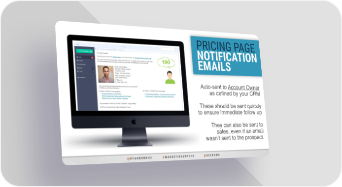 PRICING PAGE Hey Matt Lazares, NOTIFICATION Your lead just viewed the pricing page, and we sent them our standard pricing page email. If you don’t hear back from them in the next 24 hours, you might want to follow up with them! I’ve also included some resources below you can use for following up with your lead. EMAILS Name: Arun Mathew Job Title: Partner at Accel Company: Accel Phone: XX.XXXX.XXXX First Conversion: XXXXX Date: XX/XX/XXXX # Visits: 35 # Page Views: 235 Here are the best product marketing resources we recommend Auto-sent to Account Owner for follow up with Arun Matthews: PUBLIC CONTENT (for emailing): INTERNAL CONTENT (for discussing): as defined by your CRM • Product Reviews on G2 Crowd • G2 Marketing Solutions - Overview Deck (Jan 2018) • [PR] The New York Times Article on G2 Crowd • G2 Features - Organized by Persona (Feb 2018) • [Ebook] How To Run A Review Campaign Any questions? Shoot us a note! Otherwise, Happy selling! G2 Product Marketing & Sales Enablement Team These should be sent quickly to ensure immediate follow up They can also be sent to sales, even if an email wasn’t sent to the prospect. @ R Y A N B O N N I C I # M A R K E T I N G E X P O 1 8 @ G 2 C R O W D