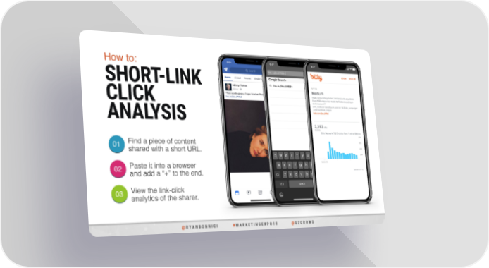 How to: SHORT-LINK CLICK ANALYSIS 01 Find a piece of content shared with a short URL. 02 Paste it into a browser and add a “+” to the end. 03 View the link-click analytics of the sharer. @ R Y A N B O N N I C I # M A R K E T I N G E X P O 1 8 @ G 2 C R O W D
