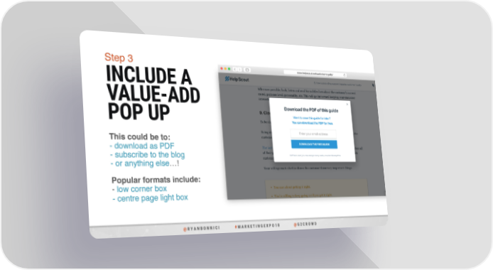Step 3 www.helpscout.net/customer-loyalty/ INCLUDE A VALUE-ADD POP UP This could be to: - download as PDF - subscribe to the blog - or anything else…! Popular formats include: - low corner box - centre page light box @ R Y A N B O N N I C I # M A R K E T I N G E X P O 1 8 @ G 2 C R O W D