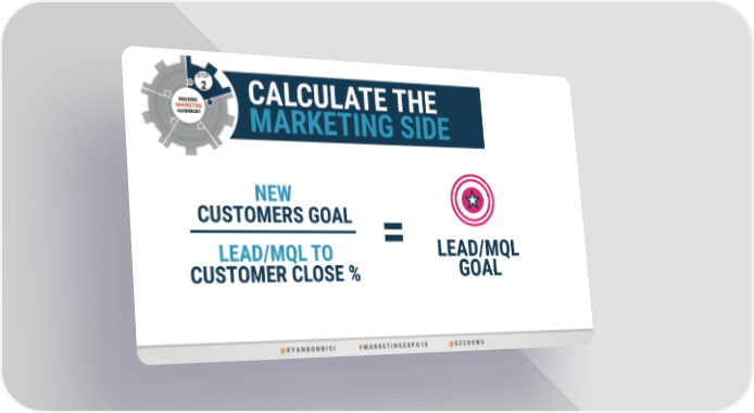 Top 5 B-to-B Marketing Hacks Page 59 Page 61STEP 2 CALCULATE THE BUILDING SMARKETING ALIGNMENT MARKETING SIDE NEW CUSTOMERS GOAL = LEAD/MQL TO LEAD/MQL CUSTOMER CLOSE % GOAL @ R Y A N B O N N I C I # M A R K E T I N G E X P O 1 8 @ G 2 C R O W D