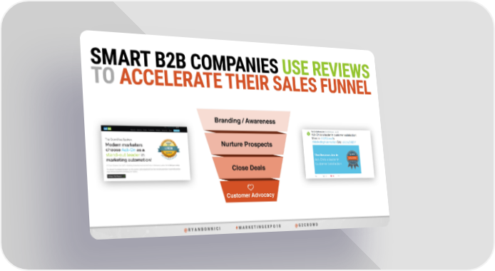 SMART B2B COMPANIES USE REVIEWS TO ACCELERATE THEIR SALES FUNNEL Branding / Awareness Nurture Prospects Close Deals Customer Advocacy @ R Y A N B O N N I C I # M A R K E T I N G E X P O 1 8 @ G 2 C R O W D