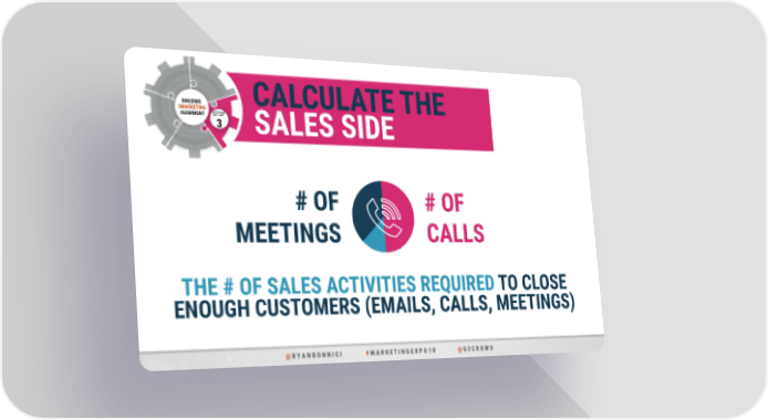 BUILDING CALCULATE THE SMARKETING ALIGNMENT STEP 3 SALES SIDE # OF # OF MEETINGS CALLS THE # OF SALES ACTIVITIES REQUIRED TO CLOSE ENOUGH CUSTOMERS (EMAILS, CALLS, MEETINGS) @ R Y A N B O N N I C I # M A R K E T I N G E X P O 1 8 @ G 2 C R O W D