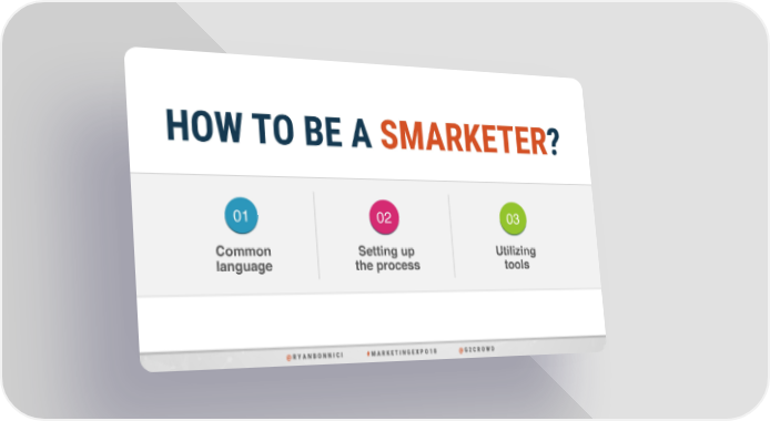 HOW TO BE A SMARKETER? 01 02 03 Common Setting up Utilizing language the process tools @ R Y A N B O N N I C I # M A R K E T I N G E X P O 1 8 @ G 2 C R O W D