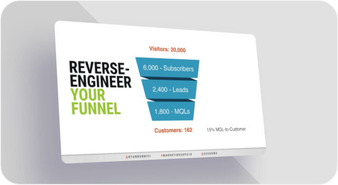 Visitors: 20,000 REVERSE- 6,000 - Subscribers ENGINEER 2,400 - Leads YOUR FUNNEL 1,800 - MQLs Customers: 162 15% MQL-to-Customer @ R Y A N B O N N I C I # M A R K E T I N G E X P O 1 8 @ G 2 C R O W D