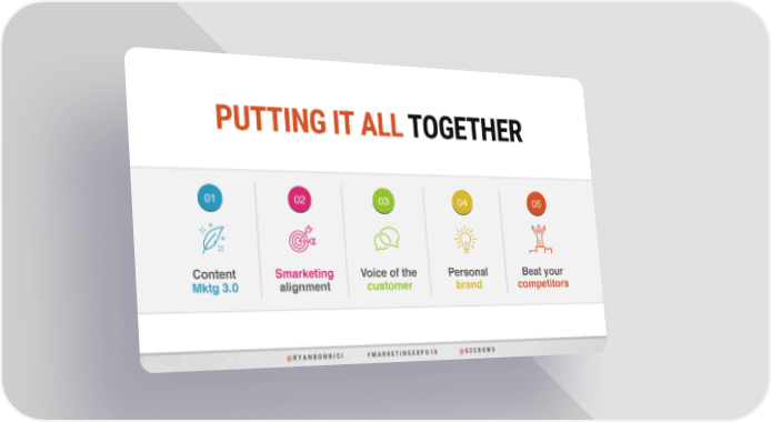 PUTTING IT ALL TOGETHER 01 02 03 04 05 Content Smarketing Voice of the Personal Beat your Mktg 3.0 alignment customer brand competitors @ R Y A N B O N N I C I # M A R K E T I N G E X P O 1 8 @ G 2 C R O W D