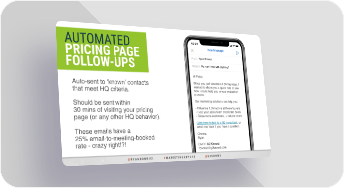 AUTOMATED PRICING PAGE From: Ryan Bonnici FOLLOW-UPS Subject: Re: can I help with anything? Hi Peter, Auto-sent to ‘known’ contacts Since you just viewed our pricing page, I wanted to shoot you a quick note to see that meet HQ criteria. how I could help you in your evaluation process. Should be sent within Our marketing solutions can help you: 30 mins of visiting your pricing - Influence 1.5M active software buyers - Help your sales team accelerate deals page (or any other HQ behavior). - Close more customers, + reduce churn Click here to talk to a G2 consultant, or These emails have a email me back if you have a question. 25% email-to-meeting-booked Cheers, rate - crazy right!?! Ryan CMO | G2 Crowd [email protected] @@ RR YY AA NN B B OO NN NN II CC II ## MM AA RR KK EE TT II NN G G EE XX PP OO 11 88 @@ G G 22 CC RR OO W W DD