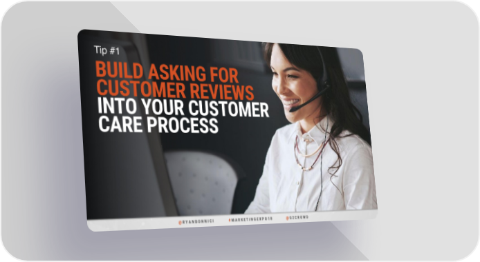 Tip #1 BUILD ASKING FOR CUSTOMER REVIEWS INTO YOUR CUSTOMER CARE PROCESS @ R Y A N B O N N I C I # M A R K E T I N G E X P O 1 8 @ G 2 C R O W D