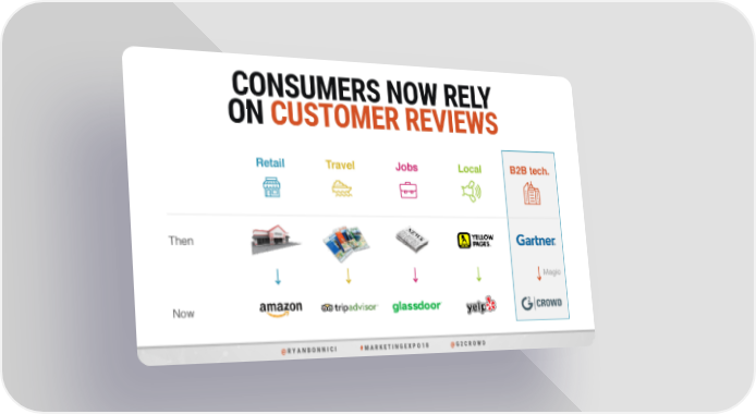 Top 5 B-to-B Marketing Hacks Page 8 Page 10CONSUMERS NOW RELY ON CUSTOMER REVIEWS Retail Travel Jobs Local B2B tech. Then Magic Now @ R Y A N B O N N I C I # M A R K E T I N G E X P O 1 8 @ G 2 C R O W D