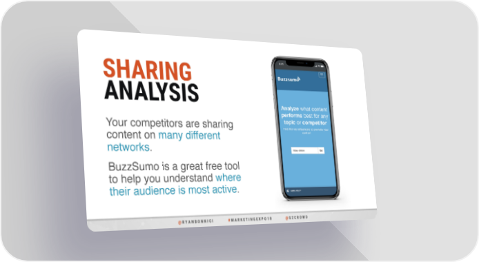 SHARING ANALYSIS Your competitors are sharing content on many different networks. BuzzSumo is a great free tool to help you understand where their audience is most active. @ R Y A N B O N N I C I # M A R K E T I N G E X P O 1 8 @ G 2 C R O W D