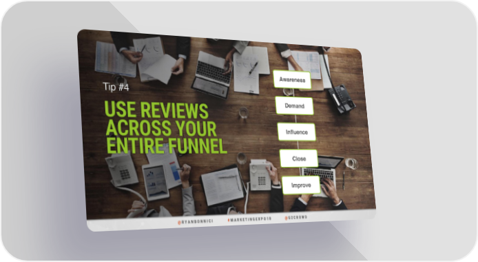 Awareness Tip #4 USE REVIEWS Demand ACROSS YOUR Influence ENTIRE FUNNEL Close Improve @ R Y A N B O N N I C I # M A R K E T I N G E X P O 1 8 @ G 2 C R O W D