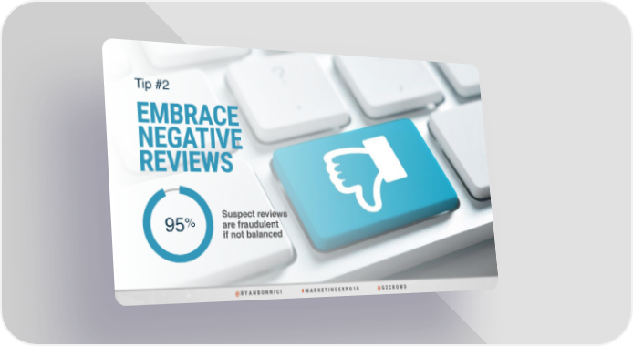 Top 5 B-to-B Marketing Hacks Page 78 Page 80Tip #2 EMBRACE NEGATIVE REVIEWS % Suspect reviews 95 are fraudulent if not balanced @ R Y A N B O N N I C I # M A R K E T I N G E X P O 1 8 @ G 2 C R O W D
