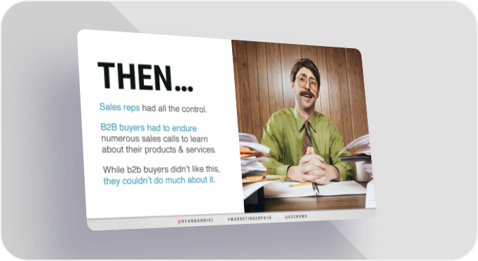 THEN… Sales reps had all the control. B2B buyers had to endure numerous sales calls to learn about their products & services. While b2b buyers didn’t like this, they couldn’t do much about it. @ R Y A N B O N N I C I # M A R K E T I N G E X P O 1 8 @ G 2 C R O W D