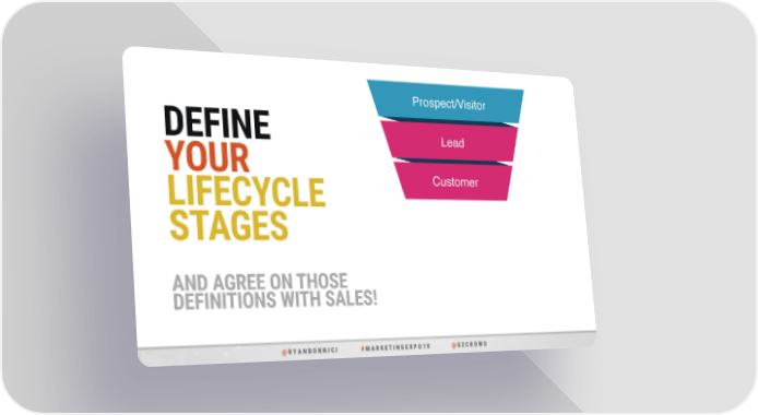 DEFINE Prospect/Visitor YOUR Lead LIFECYCLE Customer STAGES AND AGREE ON THOSE DEFINITIONS WITH SALES! @ R Y A N B O N N I C I # M A R K E T I N G E X P O 1 8 @ G 2 C R O W D